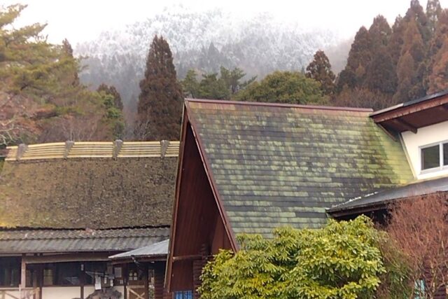 昭和62年に建てられ落ち着いた風情のあるワラ葺き屋根の食事処です。杉の皮を貼った屋根が印象的で、受付の横にあります。